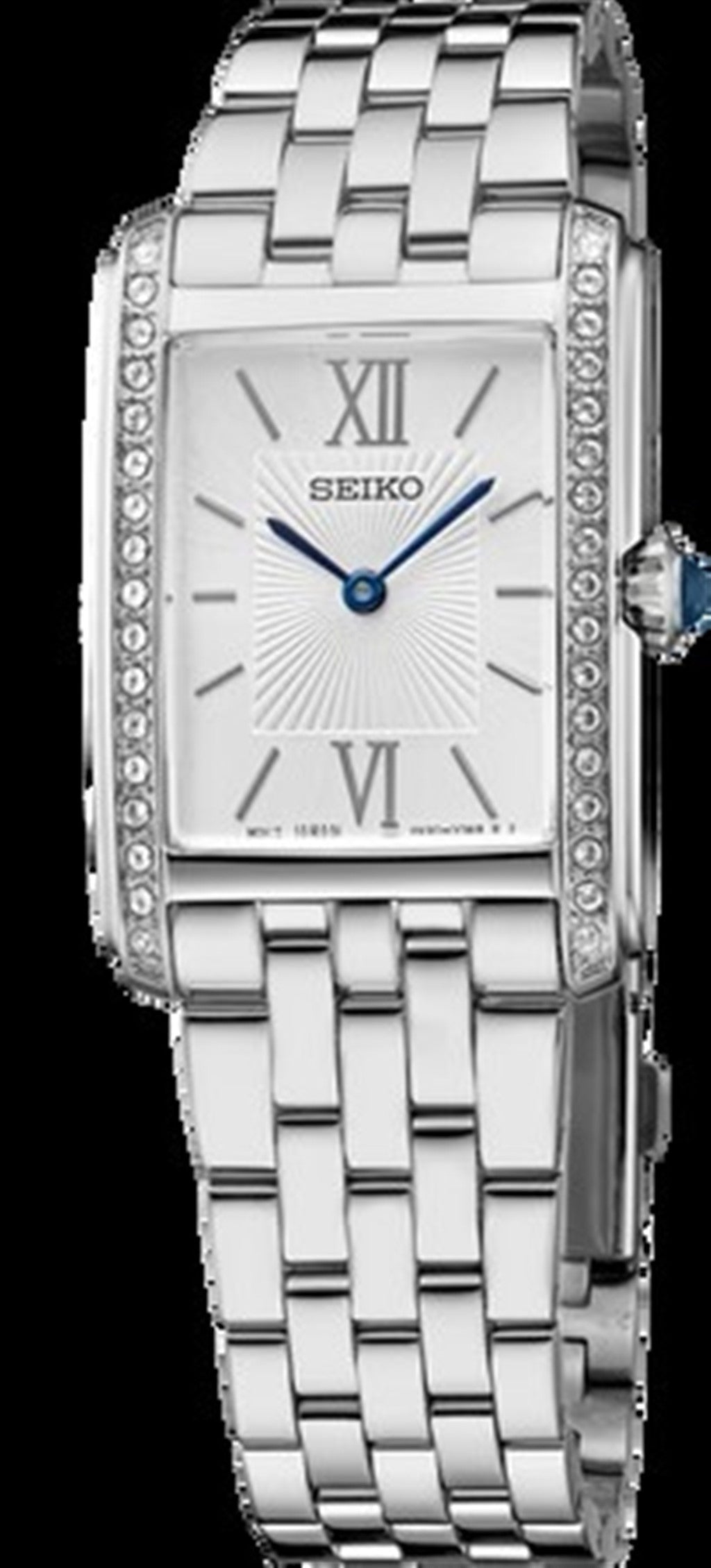From the Essentials Collection. A sophisticated classic, perfectly proportioned for a jewelry-like feel, this elegant timepiece features a rectangular case adorned by 34 crystals, a patterned white Roman numeral dial with blue hands, and a blue cabochon crown. Crafted of stainless steel, this graceful design includes a five-row stainless steel bracelet for sleek wearing comfort, and a tri-fold push button release clasp. 3 bar, 30M Water Resistant